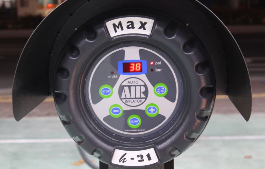 위 사진의 기계 많이 보셨죠? 타이어에 공기를 주입하는 기계입니다. 위의 사진은 PSI 단위에 빨간 LED가 점등되어있으며 가운데 숫자는 38을 표시하고 있습니다.