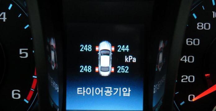 타이어의 공기압을 실시간으로 알려주는 센서입니다. 참 세상이 좋아졌습니다. 차량과 센서는 통신을 통해서 현재 차량 타이어의 공기압 값을 운전자에게 표시해 줄 수 있습니다.