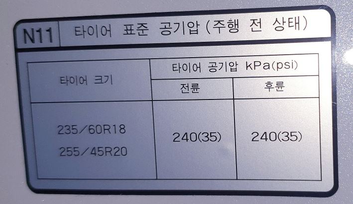 추가적으로, 해당 차량의 적정 공기압은 보통 운전석 도어를 열어보면 차체에 스티커로 표기되어있습니다.