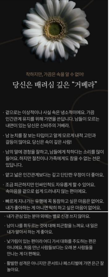 착하지만, 가끔은 속을 알 수 없어! 당신은 배려심 깊은 “거베라”