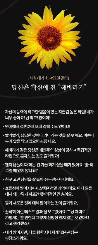 해바라기 같은 당신은 개인주의 성향이 강하고 독립적인 타입으로 혼자 노는 것도 즐거워요!