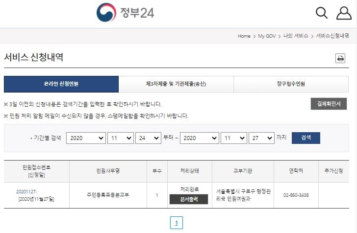 이제 민원은 신청은 끝나고, 주민등록등본 신청 민원도 완료되었습니다.