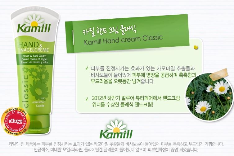 카밀이라는 브랜드는 스튜어디스들이 가장 선호하는 핸드크림 브랜드이자, 독일 하면 떠오르는 핸드크림 브랜드입니다. 카모마일 추출물이 함유되어있어 더욱 촉촉하게 우리의 손을 가꿔준답니다.